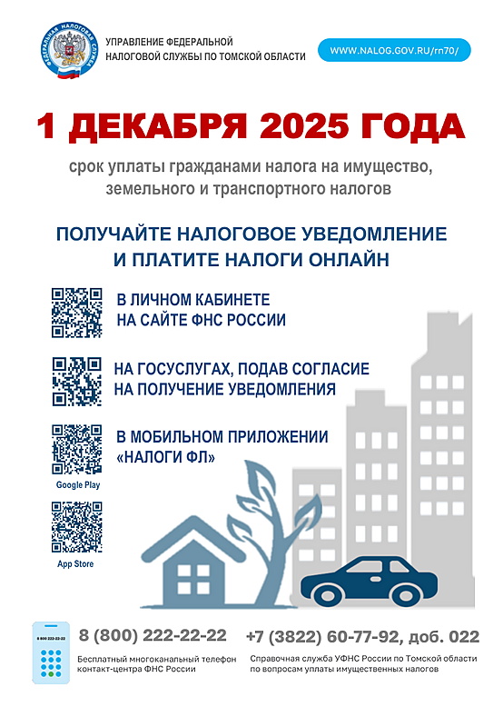 Срок уплаты имущественных налогов - не позднее 1 декабря.